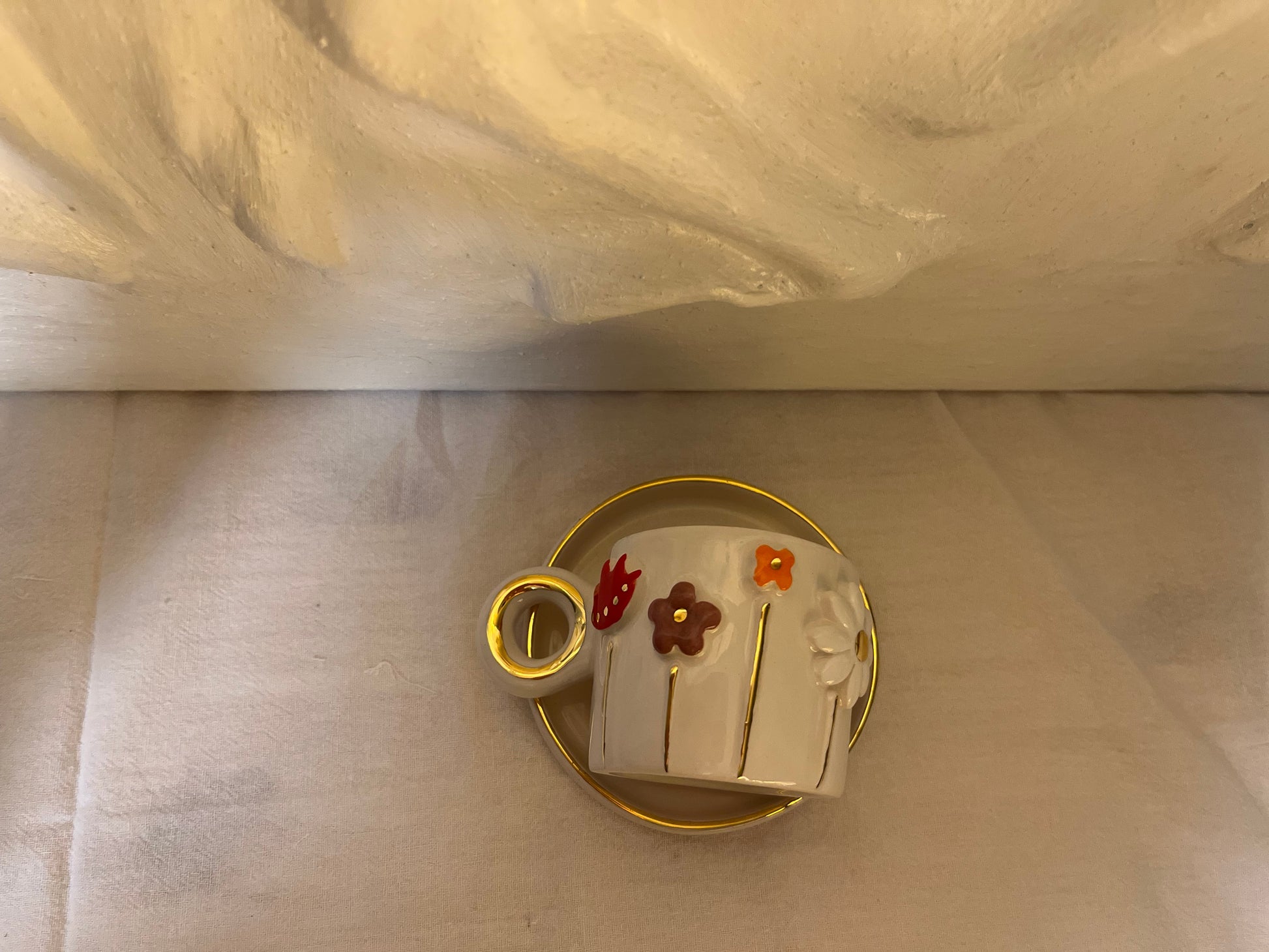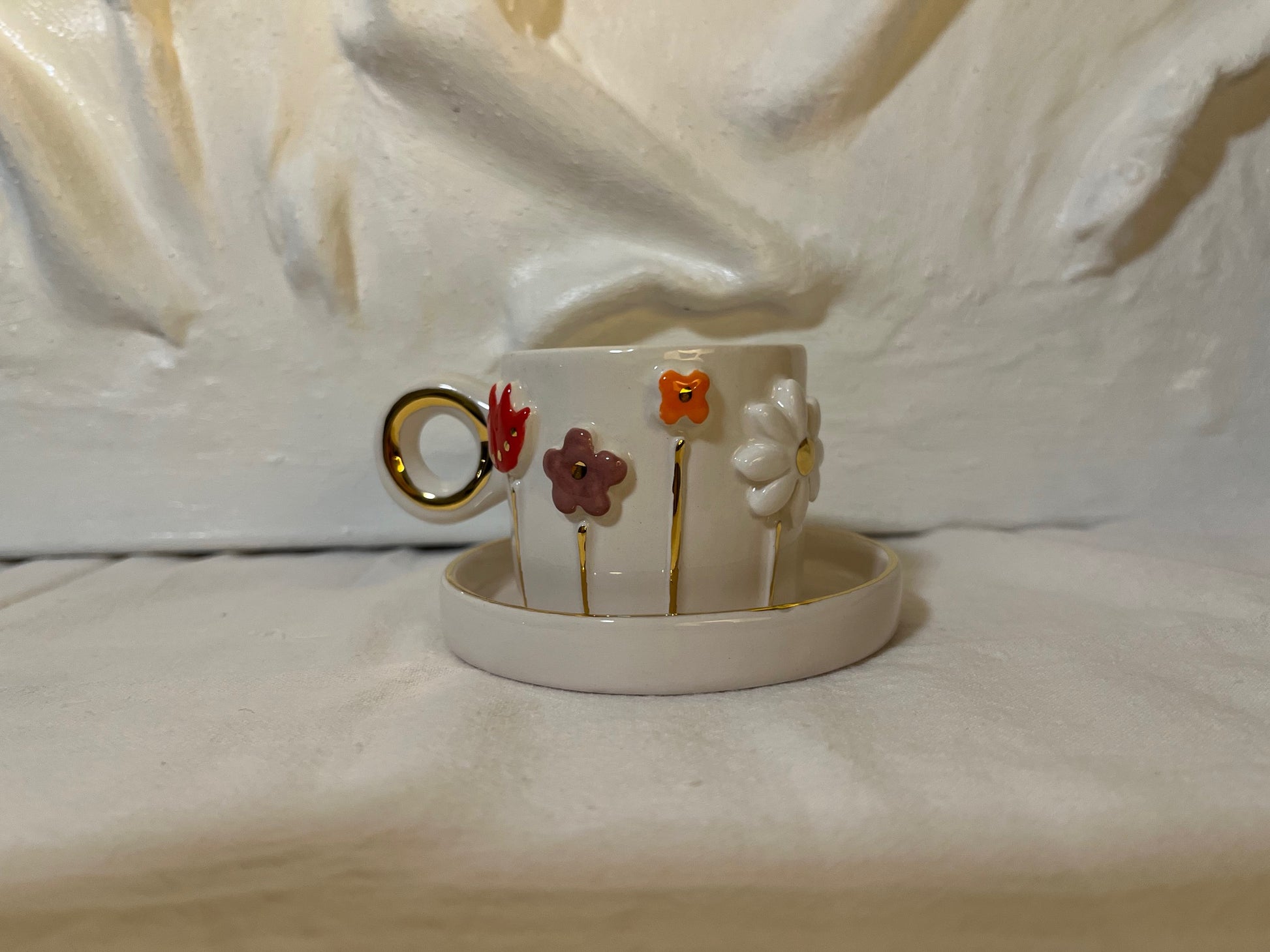 Gemaakt van aardewerk en het kopje is afgewerkt met 24 karaat vloeibaar goud.