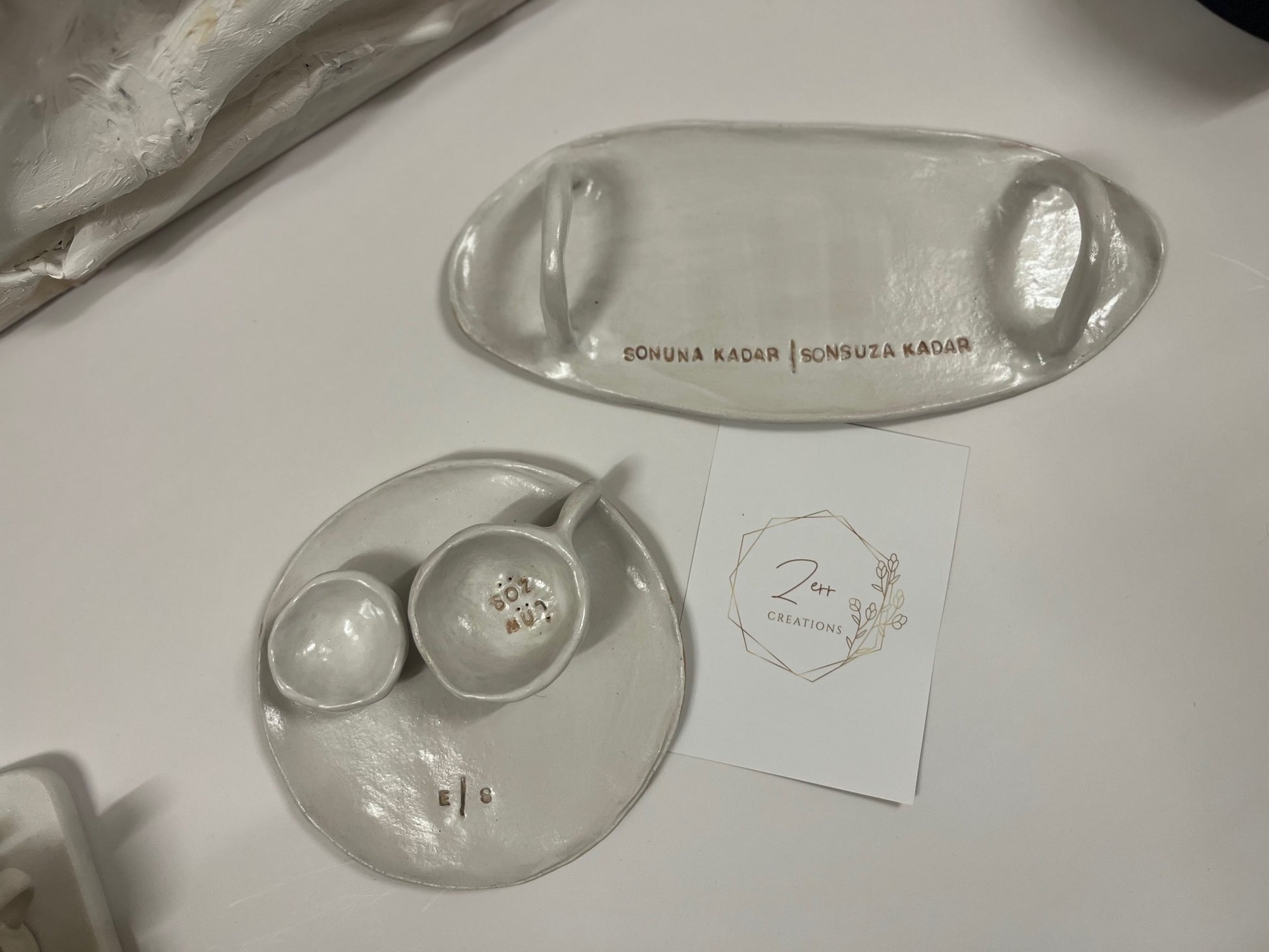 Deze set wordt speciaal voor jou gepersonaliseerd! Op de productpagina kun je boven de "Toevoegen aan winkelwagen" knop je tekst invullen. Denk aan een persoonlijke boodschap voor het ringplateau, namen, initialen of tekst voor op de mokken. Wil je de set verder uitbreiden? Dat kan! Je kunt bijvoorbeeld ringendoosjes toevoegen. Voeg alle details toe voordat je het in je winkelwagen legt.